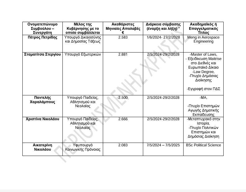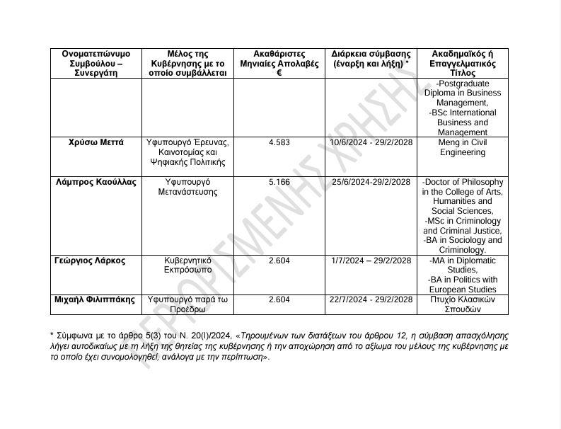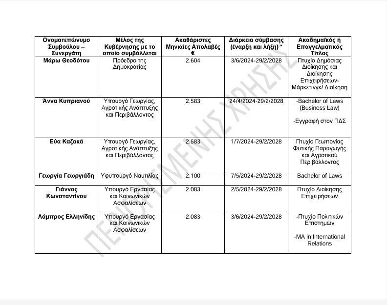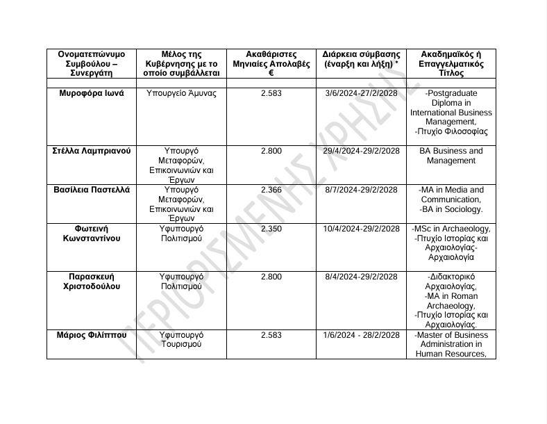 Συνολικά, 31 άτομα είναι συμβεβλημένα με μέλη της Κυβέρνησης, εκ των οποίων τα πέντε με τον Πρόεδρο της Δημοκρατίας. Αξίζει να σημειωθεί πως οι ακαθάριστες απολαβές των συμβούλων διαφέρουν, κατά κύριο λόγο, ωστόσο, κυμαίνονται από €2.000 μέχρι €2.800, ενώ υπάρχουν και κάποιες περιπτώσεις που ξεπερνούν τις €4.000 ακόμα και τις €5.000.  Παράλληλα, διαπιστώνεται με βάση τους πίνακες πως όλοι οι διορισθέντες σύμβουλοι / συνεργάτες είναι κάτοχοι πτυχίου, με αρκετούς εξ αυτών να είναι επίσης, κάτοχοι μεταπτυχιακών και διδακτορικών τίτλων. Υπενθυμίζεται πως αντιδράσεις είχαν προκληθεί μετά την αποκάλυψη της Ελεγκτικής Υπηρεσίας το περασμένο καλοκαίρι για τέσσερις συμβούλους που δεν κατείχαν πτυχίο πανεπιστημίου, με την Κυβέρνηση να προχωρά στον τερματισμό των υπηρεσιών τους, μετά την ψήφιση της σχετικής νομοθεσίας.