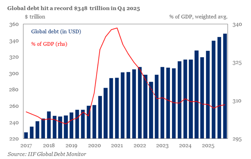 Συγκεκριμένα, το συνολικό παγκόσμιο χρέος — συμπεριλαμβανομένων των δημόσιων και εταιρικών δανείων — αυξήθηκε κατά 29 τρισ. δολάρια το 2025, σύμφωνα με το Διεθνές Χρηματοπιστωτικό Ινστιτούτο (IIF).