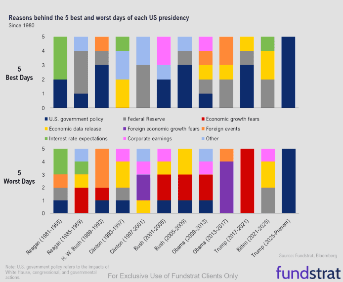 Τα ευρήματα της Fundstrat υποδηλώνουν ότι οι πολιτικές του Τραμπ — και οι ανατροπές τους — έχουν διαδραματίσει τεράστιο ρόλο στην πρόκληση μεταβλητότητας στην αγορά, με τους επενδυτές να αντιδρούν όχι μόνο σε νέες ανακοινώσεις, αλλά και στο αν ο Πρόεδρος φαινόταν να κλιμακώνει, να μετριάζει ή να υποχωρεί.
