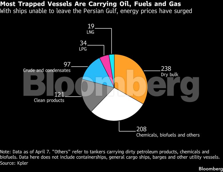 Τα πλοία μεταφοράς ενέργειας αποτελούν μεγάλο μέρος του στόλου που παραμένει εγκλωβισμένος στον Κόλπο, σύμφωνα με στοιχεία της Kpler. Συνολικά, 426 δεξαμενόπλοια μεταφέρουν αργό πετρέλαιο και καθαρά καύσιμα, ενώ 34 πλοία μεταφέρουν LPG και 19 υγροποιημένο φυσικό αέριο. Τα υπόλοιπα μεταφέρουν ξηρά φορτία, όπως αγροτικά προϊόντα, μέταλλα ή εμπορευματοκιβώτια.