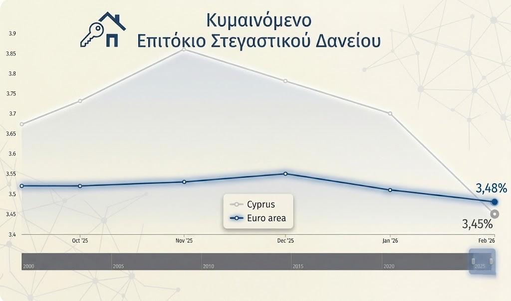 Υποχώρηση στο κόστος δανεισμού κάτω από τον μέσο όρο της ευρωζώνης καταγράφηκε τον περασμένο Φεβρουάριο και στην κατηγορία των δανείων με κυμαινόμενο επιτόκιο, η οποία «παραδοσιακά» αποτελεί τη βάση των στεγαστικών δανείων στην κυπριακή αγορά. Σύμφωνα με τα στοιχεία της ΕΚΤ, το κυμαινόμενο επιτόκιο στεγαστικών δανείων στην Κύπρο διαμορφώθηκε στο 3,45%, ελαφρώς χαμηλότερα από το 3,48% που καταγράφεται ως μέσος όρος στη ζώνη του ευρώ. Υπό αυτά τα δεδομένα η Κύπρος βρισκόταν στο μέσο του πίνακα των χωρών της ευρωζώνης και συγκεκριμένα  στη 10η θέση της κατάταξης. Η προηγούμενη φορά που το ύψος του κυμαινόμενου επιτοκίου στην Κύπρο είχε υποχωρήσει κάτω από τον μέσο όρο της ευρωζώνης ήταν τον Απρίλιο του 2025 όταν βρισκόταν στο 3,78% έναντι 3,85%.