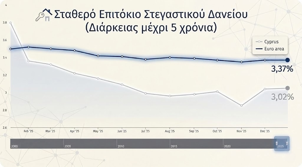 Η πιο σημαντική απόκλιση υπέρ του Κύπριου δανειολήπτη καταγράφεται στα στεγαστικά δάνεια με σταθερό επιτόκιο από ένα έως πέντε έτη. Στη συγκεκριμένη κατηγορία, το επιτόκιο στην Κύπρο διαμορφώθηκε τον Φεβρουάριο στο 3,02%, την ίδια ώρα που ο μέσος όρος στην Ευρωζώνη ήταν στο 3,37%. Η διαφορά των 35 μονάδων βάσης καθιστά τη συγκεκριμένη επιλογή την πλέον προσιτή, προσφέροντας σταθερότητα με ονομαστικό κόστος σημαντικά χαμηλότερο από το ευρωπαϊκό επίπεδο. Το επιτόκιο που προσφέρεται στην Κύπρο είναι το έκτο πιο ελκυστικό ανάμεσα στις 21 χώρες της ευρωζώνης. Το πλέον σημαντικό όμως είναι ότι βρίσκεται σταθερά κάτω από τον μέσο όρο της ευρωζώνης για ένα χρόνο. Συγκεκριμένα είχε περάσει κάτω από τον μέσο όρο τον Φεβρουάριο του 2025. Σημειώνεται ότι τα τελευταία χρόνια αυξήθηκαν σημαντικά οι δανειολήπτες, που επιλέγουν σταθερότητα στις δόσεις των δανείων τους. Η τάση αυτή ενισχύθηκε μετά τις αυξήσεις των επιτοκίων από την Ευρωπαϊκή Κεντρική Τράπεζα προς αντιμετώπιση του υψηλού πληθωρισμού, που προκλήθηκε μετά την πανδημία και ειδικότερα μετά τη ρωσική εισβολή στην Ουκρανία το 2022.