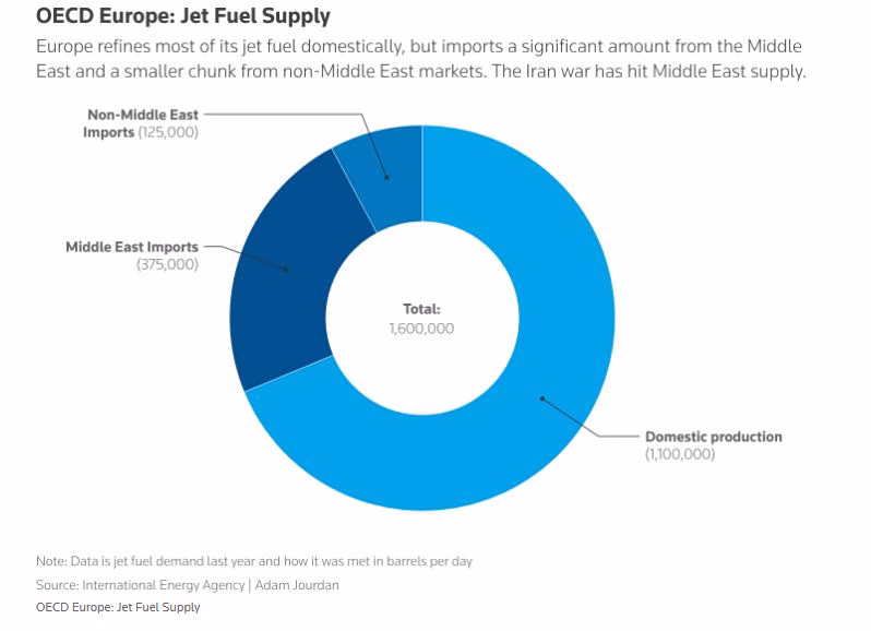 Σύμφωνα με στοιχεία του ΔΟΕ, η περιοχή της Ευρώπης όπως την ορίζει ο ΟΟΣΑ, η οποία περιλαμβάνει τις χώρες της ΕΕ καθώς και άλλες όπως η Βρετανία και η Νορβηγία, εισάγει πάνω από το 30% των καυσίμων αεροσκαφών της, με το μεγαλύτερο μέρος να διέρχεται από τα Στενά του Ορμούζ.